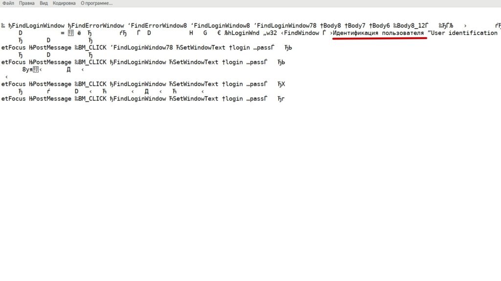 Ладно, возвращаемся к нашим «баранам». Мне понравилась идея этого робота. Но получив неработающее решение, я столкнулся с выбором: отказаться от идеи или копать глубже. Для начала я выяснил, что основа робота находится в файле с расширением .luas. А это код, в который внести изменения можно только после декомпиляции и последующей повторной компиляции. Заморачиваться с этим я не захотел, но простой просмотр файла в обычном текстовом редакторе сразу выявил проблему: окно ввода пароля в роботе указано, как «Идентификация пользователя», и это было актуально несколько лет назад.