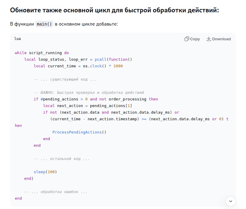 Я не стал изучать Lua — язык, на котором должен был строиться мой робот. Вместо этого я учился говорить на языке намерений, логики и бизнес-процессов. «Вот ситуация на рынке, вот как должен отреагировать алгоритм, вот условия срабатывания» — так выглядели мои промпты. ИИ переводил их в строки кода, словно универсальный синхронный переводчик с человеческого на машинный. Это было похоже на волшебство: ты описываешь поведение, а через мгновение получаешь его техническое воплощение. Но, как и любое волшебство в мире технологий, оно имело свою цену и свои специфические правила.