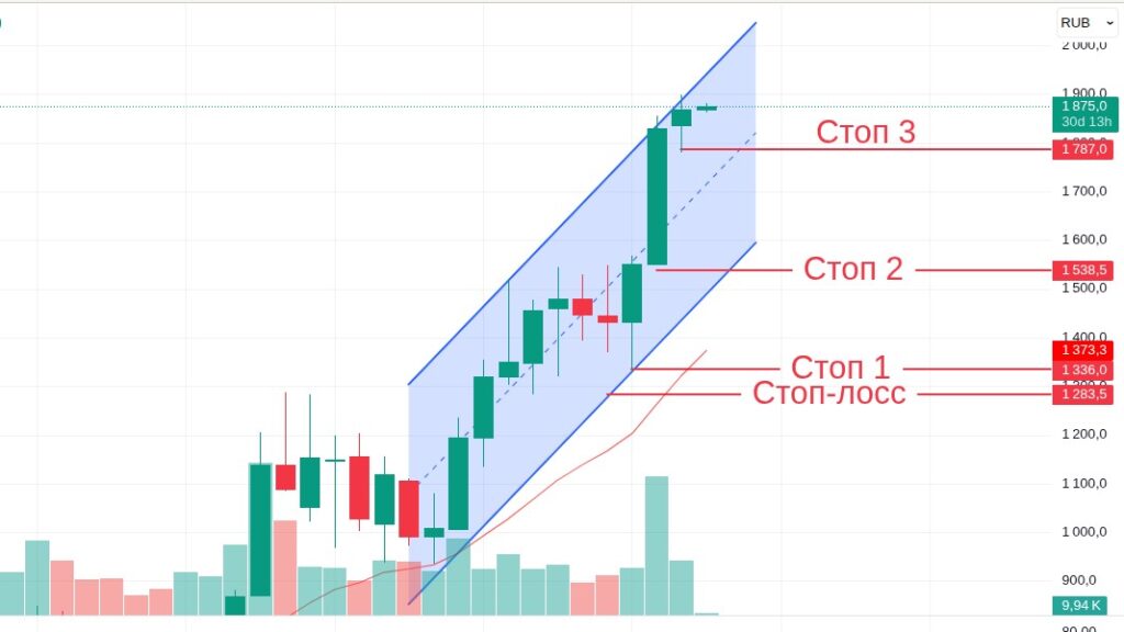 Допустим в июле 2025 года, торгуя на месячном таймфрейме я купил акции Лента по цене 1 432 рублей (цена закрытия июньской свечи). Стоп-лосс установил на уровне 1 287,5 рублей. В первый день августа я передвигаю стоп под срез июльской свечи (минимальная цена за июль): Стоп 1 — 1 333,5 рублей, в первый день сентября: Стоп 2 — 1 548,5 рублей и в первый день октября: Стоп 3 — 1 780,5 рублей. Если в октябре цена развернется, то сделка закроется по стопу на цене 1 780,5 рублей, прибыль составит 348,5 рублей, или +24,34%.